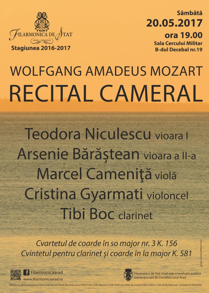 Un nou medalion Wolfgang Amadeus Mozart se concretizează în planul de concerte al Filarmonicii, în seara de sâmbătă, 20 Mai 2017, la ora 19.00, într-un program cameral asumat de membrii orchestrei simfonice Greti Niculescu (vioara I), Arsenie Bărăştean (vioara a II-a), Marcel Cameniţă (violă), Cristina Ungurean (violoncel) şi Tibi Boc (clarinet).