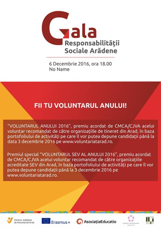 Centrul Județean de Voluntariat Arad împreună cu Asociația Educatio, Centrul de Excelență pentru Elevi și CMCA, organizează Gala Responsabilității Sociale în scopul recunoașterii și promovării responsabilității sociale integrând principiile dezvoltării durabile și bunei guvernanțe în managementul proiectelor.