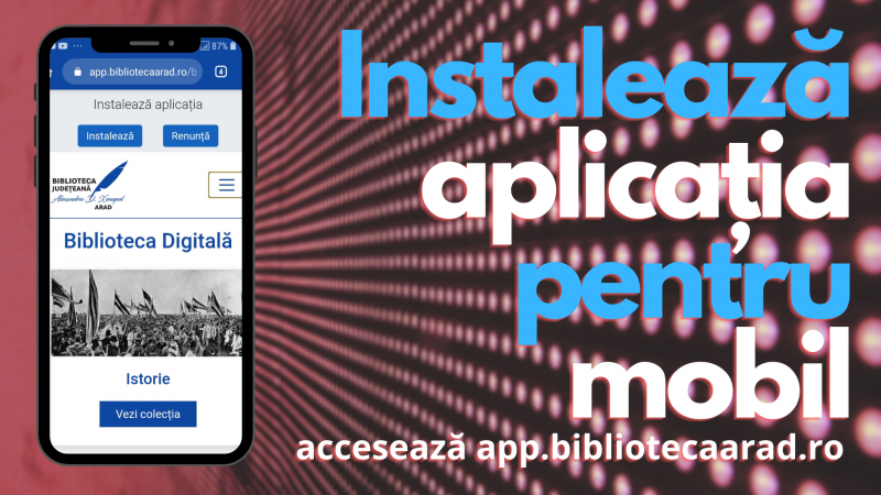 Cum se instalează? Deschide Google Chrome și tastează app.bibliotecaarad.ro în bara de adrese. După ce aplicația se încarcă, în partea de sus a ecranului se găsește butonul pentru instalare. Menționăm că aplicația pentru mobil nu necesită permisiuni speciale pentru instalare. Aplicația poate fi instalată folosind și alte browsere (de exemplu, Mozilla Firefox sau Safari) activând opțiunea „Add to home screen” („Adaugă pe ecranul Acasă”) sau „Install” din meniul browserului.