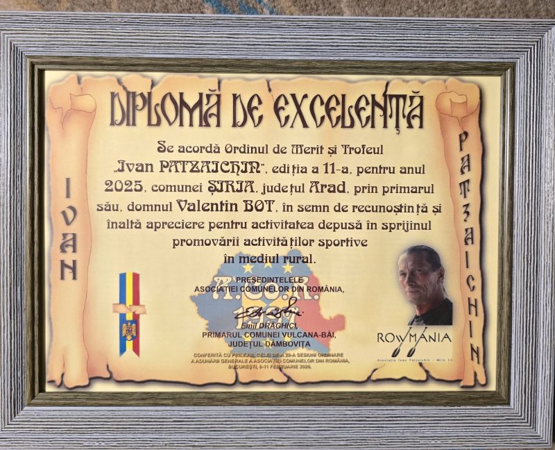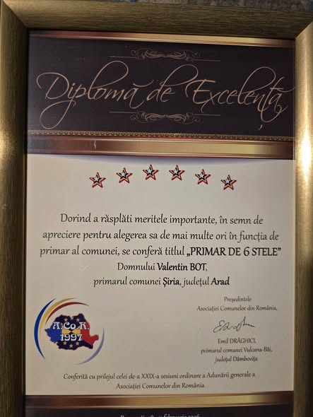 Comuna Șiria a fost reprezentată cu onoare în cadrul evenimentului organizat de Asociația Comunelor din România (ACoR), unde primarul comunei, ing. Valentin Bot, a primit două distincții importante pentru activitatea sa în administrația publică locală și pentru susținerea sportului în mediul rural.